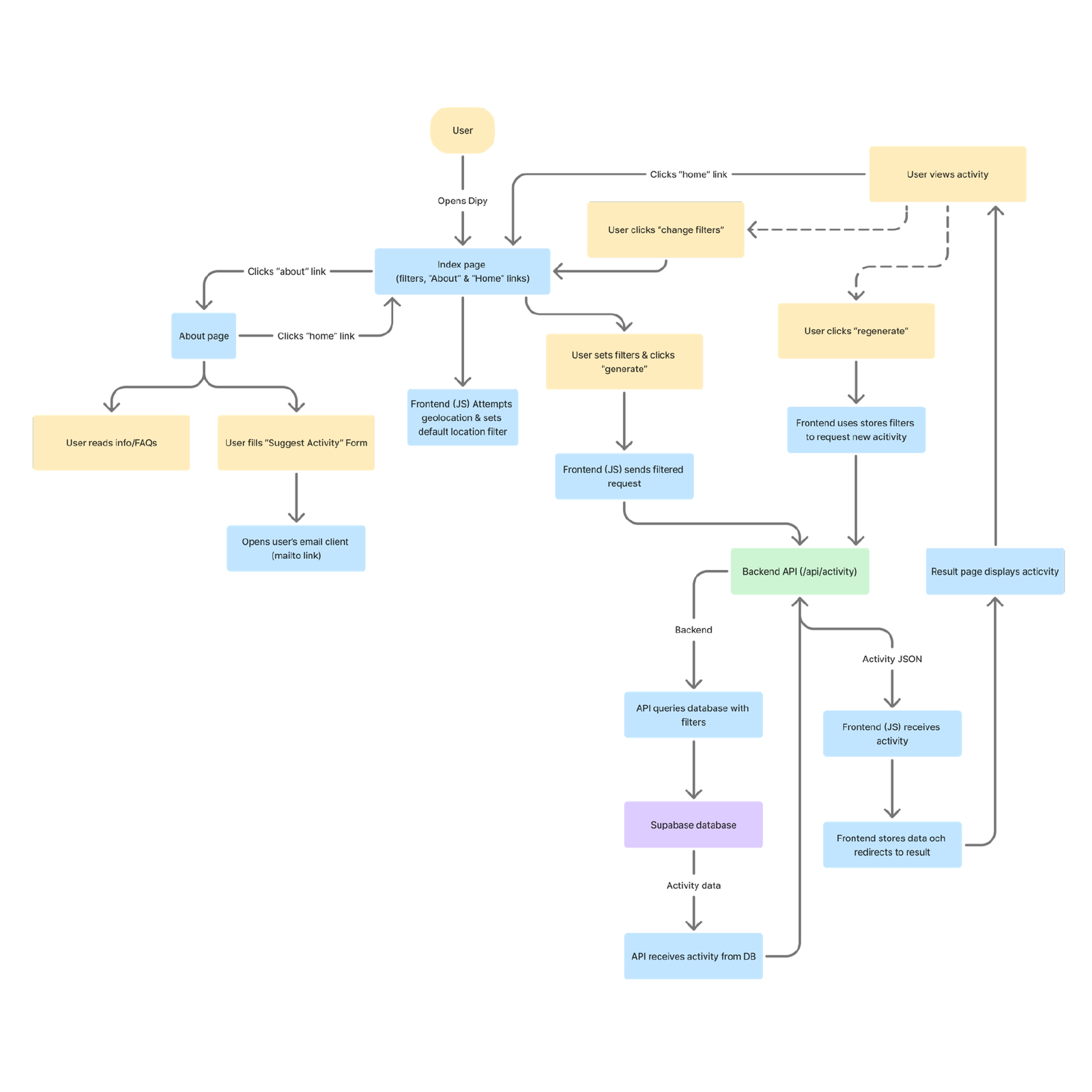 The application fetches location data, filters based on the user’s choices and returns a random but relevant activity suggestion. This is complemented by sharing, onboarding and analytics tracking for further evaluation.